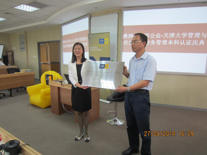 澳洲會計師公會北京代表處首席代表王瑾女士向天津大學管理與經濟學部副主任楊寶臣頒授香港澳洲會計師公會認證證書