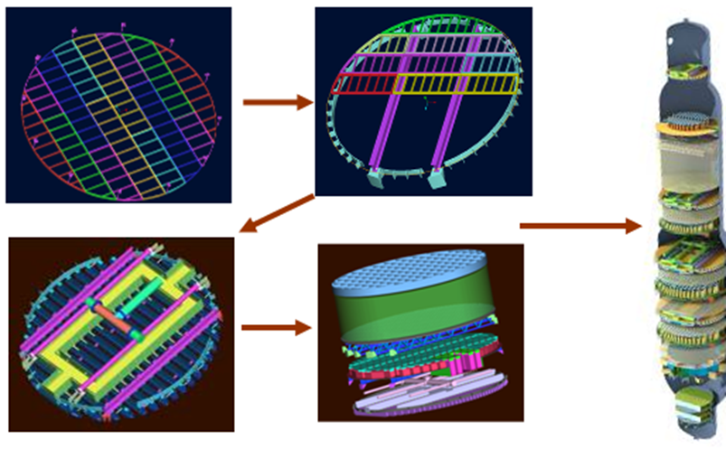 從本質上來說,蒸餾過程在塔板和填料上屬于氣液兩相流動傳熱傳質過程,在氣體分布、液體分布、塔內氣液流動等存在大量多相流體力學問題,特別是對于一些在非常規條件下操作的塔器(如高溫、高壓、易燃、易爆等)因條件苛刻,實驗模擬難度很大。為了克服這一難題,李鑫鋼教授帶領團隊成員創造性地應用現代信息技術、三維圖形技術、過程分析與優化方法,形成多組元復雜蒸餾過程多相流體系的應用模型,建立了大型蒸餾過程設計、診斷的工程學新方法,并成功應用于大型煉油減壓、乙烯急冷裝置的研究開發和工程設計中,建立了大型蒸餾過程設計的工程學新方法。此外,首次將三維結構可視化、流體流態可視化和內件形變可視化技術用于蒸餾裝置內部構件的優化與設計中,實現了蒸餾過程整體設計水平的提升。開發的高效低阻力的塔填料,高性能氣體、液體分布器,大型微變形支撐裝置等多項專利技術和產品,解決了煉油常減壓裝置大型化帶來的流體分布不均、設備阻力大、能耗高等技術難題和長周期運轉帶來的裝置變形、堵塞等工程實際難題。針對大型乙烯裝置汽油急冷裝置,開發出塔盤低液面梯度、氣液均布、抗堵塞等多項關鍵新技術,研制了高效三溢流塔盤、折返流氣體分布器等多項新產品,解決了長期以來束縛我國乙烯急冷裝置大型化和長周期運行的重要難題。開發的煉油減壓蒸餾裝置,多次創造國內最大直徑塔器的研制記錄(13.7米),研究成果獲國家科學技術進步二等獎,乙烯急冷裝置也突破了國外對我國大型乙烯急冷技術的壁壘,工程化成果覆蓋了我國新建大型乙烯急冷裝置的60%,研究成果獲教育部科學技術進步二等獎。